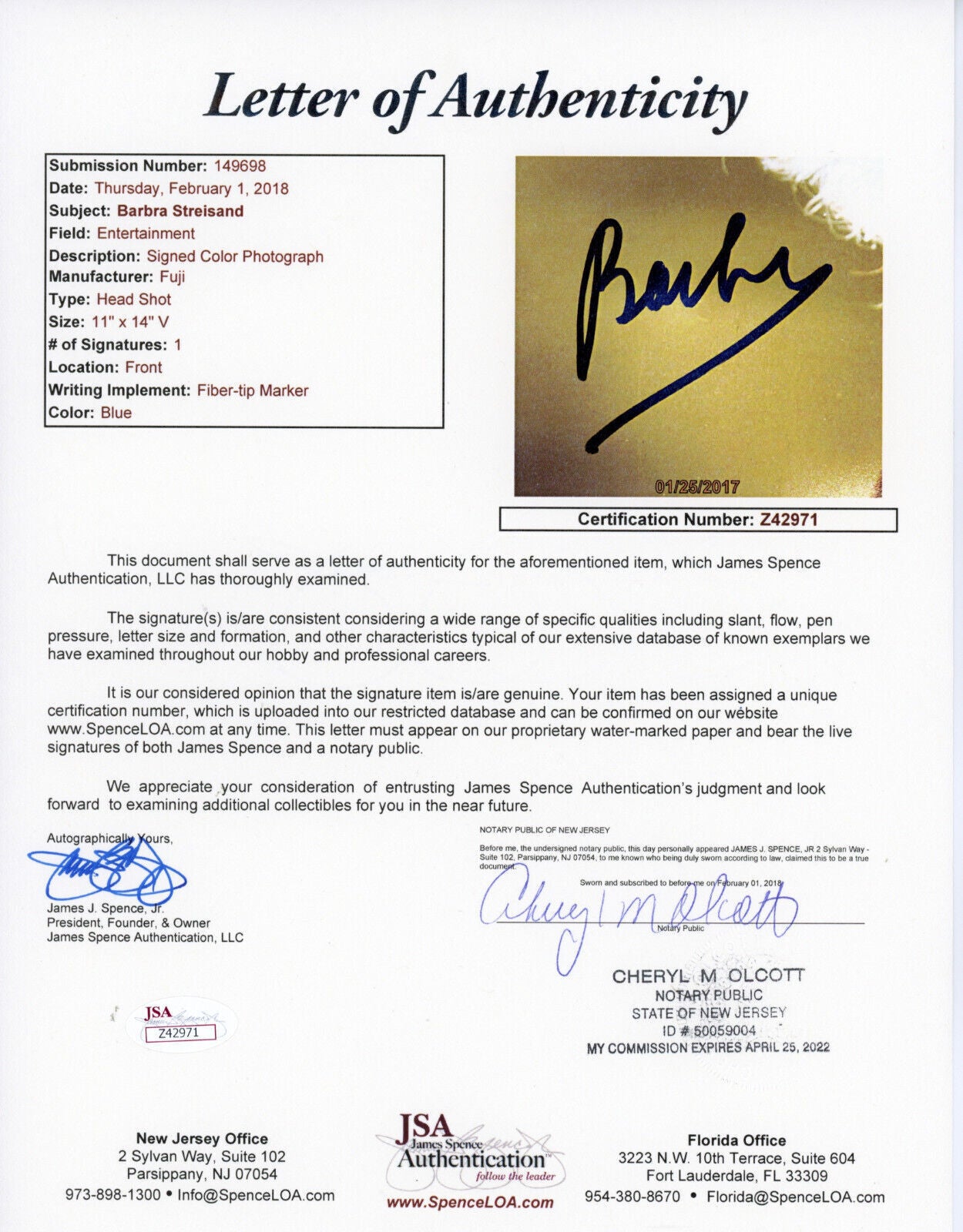 CERTIFIED BY JSA AUTHENTICATION # Z42971