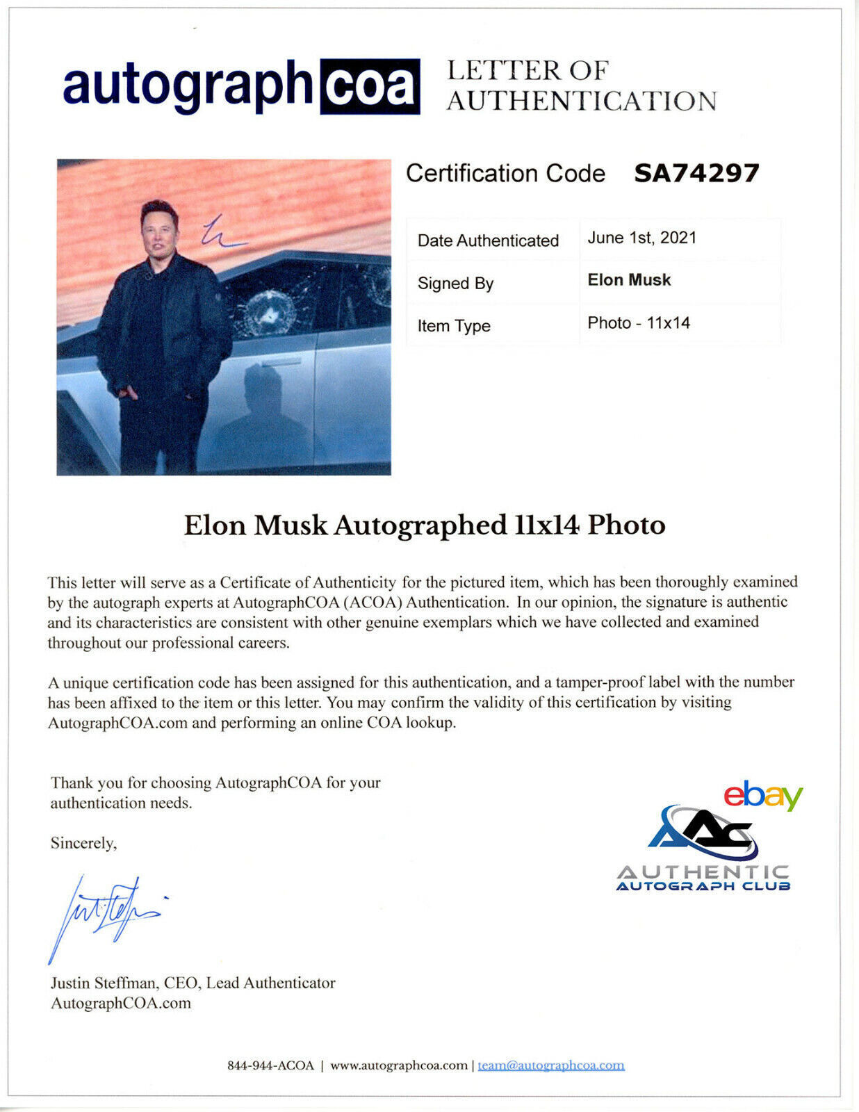 ELON MUSK AUTOGRAPH SIGNED 11x14 PHOTO TESLA SPACEX LOA ACOA