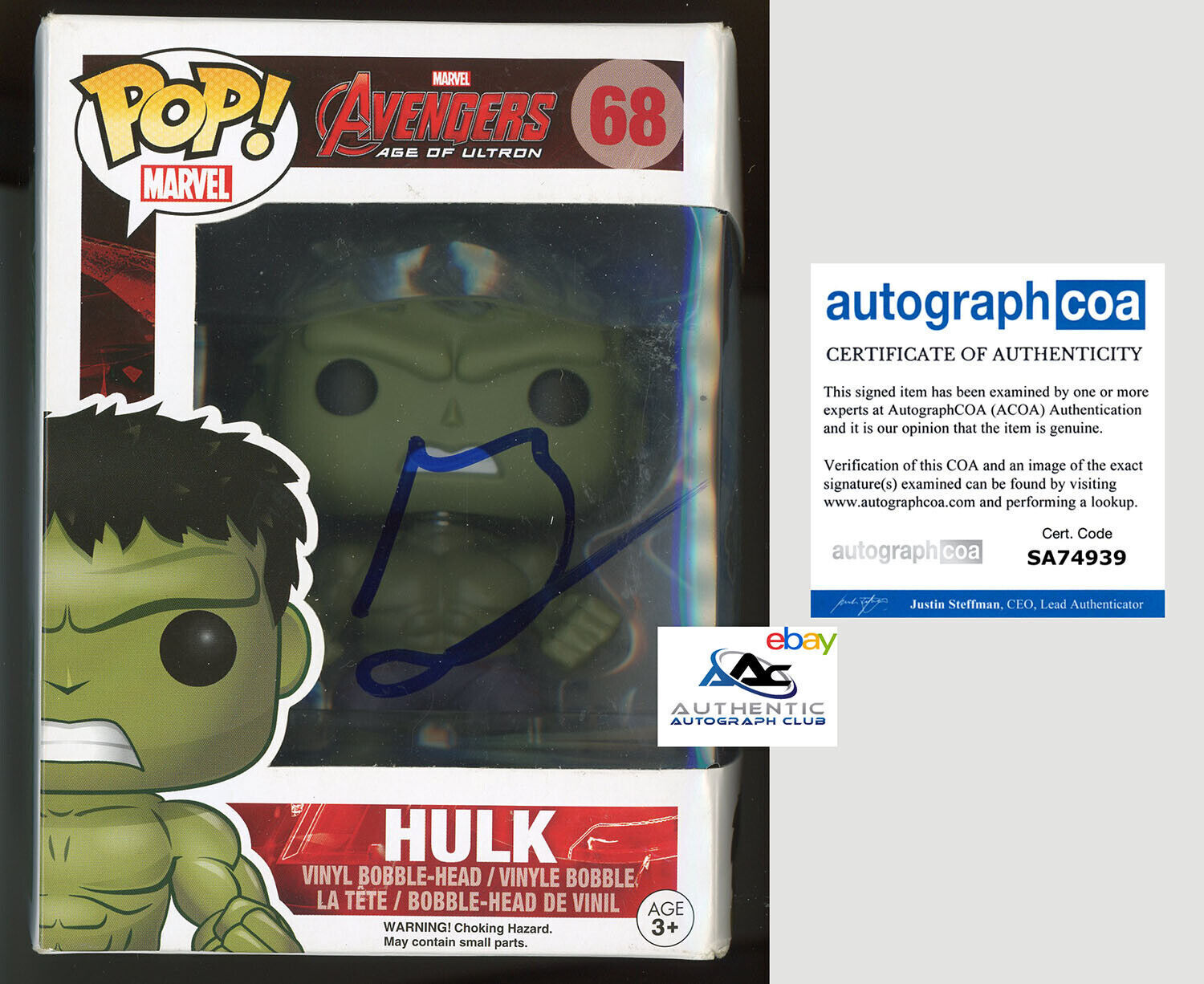 MARK RUFFALO AUTOGRAPH SIGNED HULK AVENGERS ULTRON FUNKO POP TOY 68 MARVEL ACOA